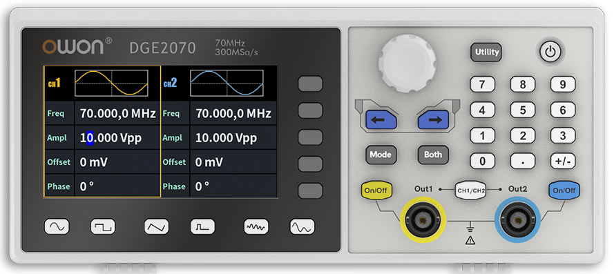 Универсальный 2-х канальный генератор сигналов произвольной формы бюджетного ценового класса OWON DGE2070 с рабочей полосой пропускания по частоте до 70 МГц. Старшая модель в линейке приборов OWON DGE2000.