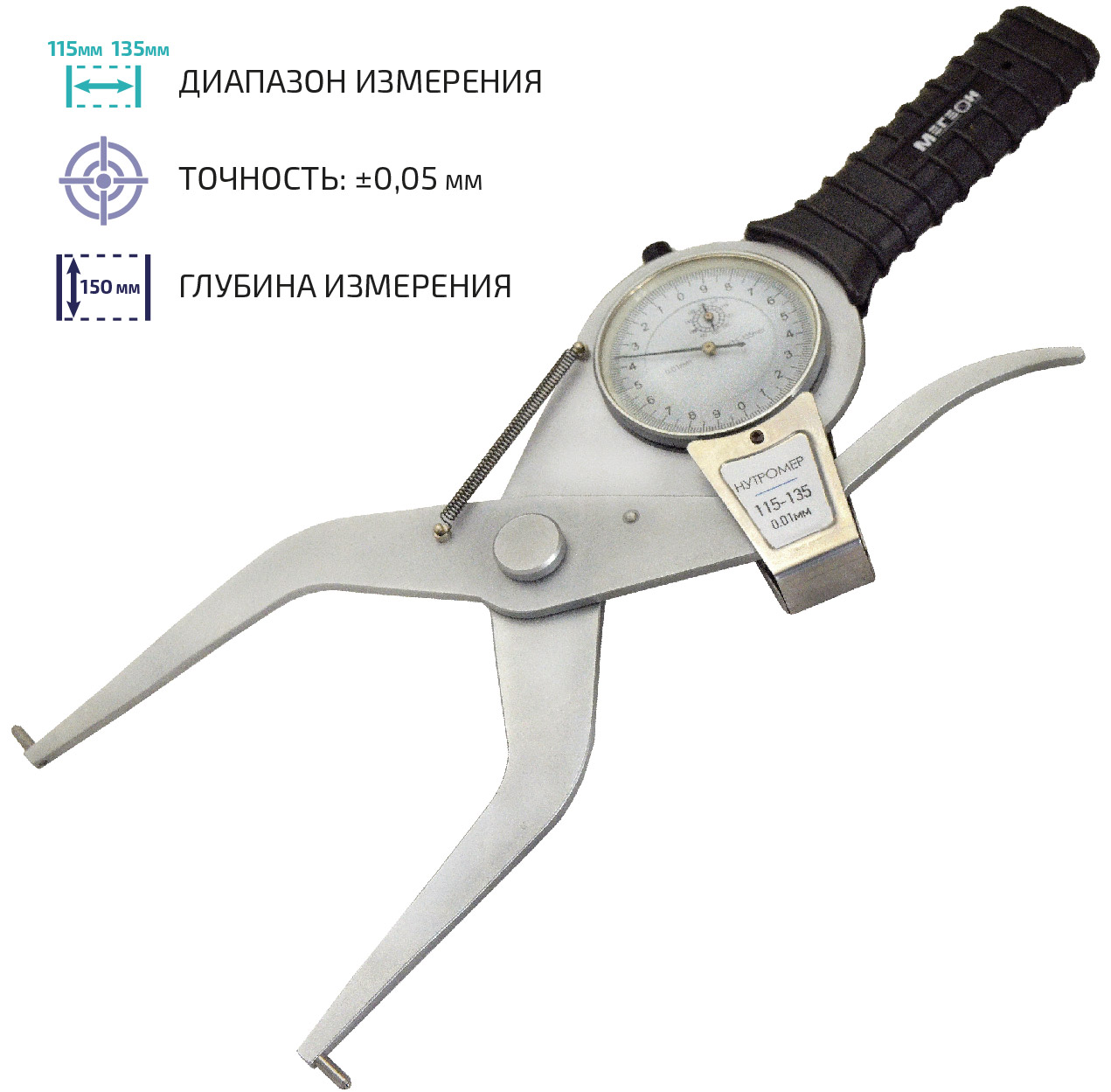 Нутромер микрометрический МЕГЕОН 80135 предназначен для измерения с высокой точностью внутренних размеров изделий относительным методом. В основе считывающего устройства применён индикатор часового типа с ценой деления 0,01 мм. Прибор имеет новую конструкцию ножничного типа, отличную от классических нутромеров. Здесь отсутствуют барабан, трехётка и стебель. К одному из важных преимуществ можно отнести быструю настройку изделия. Применение возможно в диапазоне диаметра отверстия 115...135 миллиметров. Обрезиненная ручка исключит проскальзывания прибора в руках, а наличие антикоррозийного покрытия на элементах конструкции предотвратит повреждение прибора ржавчиной при попадании нежелательной влаги и увеличивает срок эксплуатации. Для настройки ноля требуется установочная скоба 115 мм (приобретается отдельно).