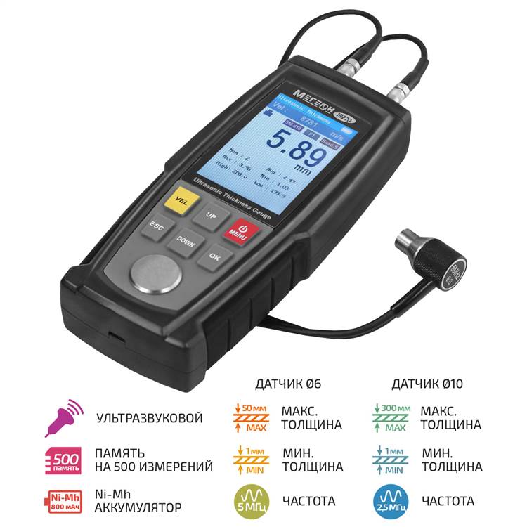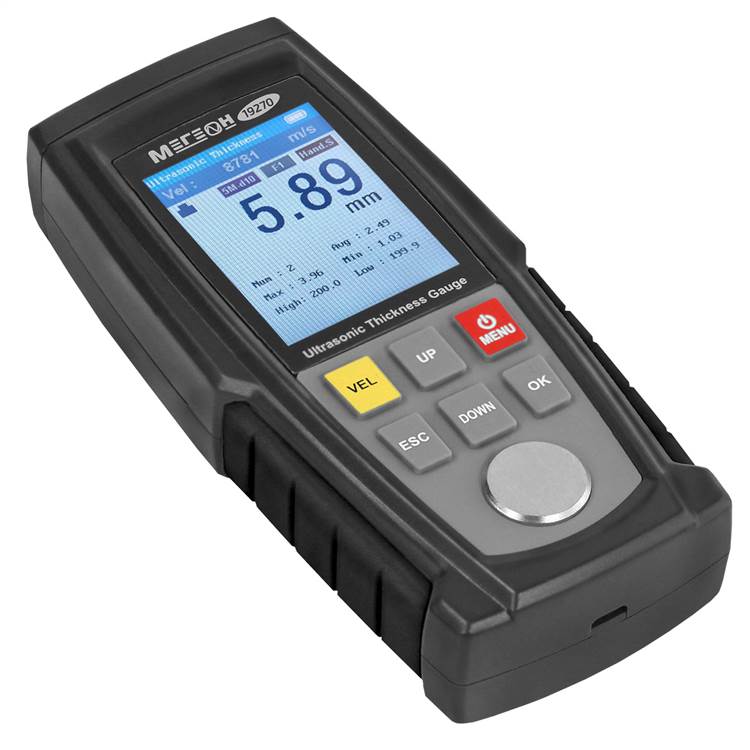 МЕГЕОН 19270 – это ультразвуковой измеритель толщины различных материалов. Наличие двух датчиков увеличивает сферу выполняемых работ и облегчает эксплуатацию. Благодаря настраиваемой скорости звука можно измерять толщину до 300 мм с низкой погрешностью, а применение современных комплектующих прибор обеспечивает быстрое проведения замеров. Станет незаменимым помощником в промышленном производстве, а также контроле трубопроводов под давлением. Также может быть широко использован в обработке металла, торговле и других отраслях. Имеет обширный набор корректируемых параметров, установок и внутреннюю память общим количеством 500 измерений. Питание осуществляется от трёх перезаряжаемых Ni-Mh аккумуляторов, что в свою очередь даёт возможность снизить траты на приобретение одноразовых неперезаряжаемых батарей. Безопасное хранение и транспортировка изделия и комплекта приспособлений обеспечивается противоударным кейсом.